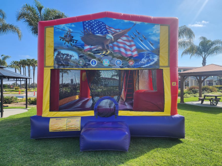 Larger than the Fun Style Combos is our 4 in 1. Complete with a larger bouncy area, taller climber and internal slide and a basketball hoop on the inside back left tower.