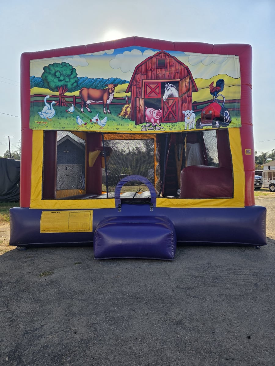 Larger than the Fun Style Combos is our 4 in 1. Complete with a larger bouncy area, taller climber and internal slide and a basketball hoop on the inside back left tower.