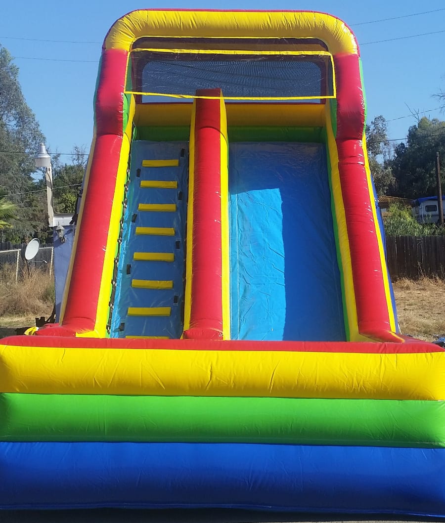 Not Too Tall - Not Too Small Users enter/exit and climb up the inflated stairway on the left side and slide down on the right side. Price is for 4 hours. Additional $25 for each additional hour (designed for ages 6 - 16 but can be used by adults as well.)
